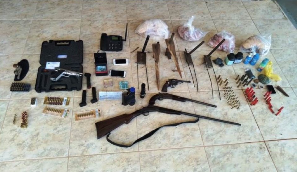 A equipe do 2º Pelotão da 1ª Companhia do BPMA realizou as fiscalizações e deteve dois indivíduos. Juntamente com eles foram encontrados dois revólveres, uma pistola, uma espingarda; um garruchão; 178 munições intactas e 126 munições deflagradas de diversos calibres, além de dois tatus abatidos, uma banda de Paca abatida e uma outra metade de animal abatido (não sendo possível a identificação deste), além de outros materiais e cinco armadilhas utilizadas para a prática de caça.