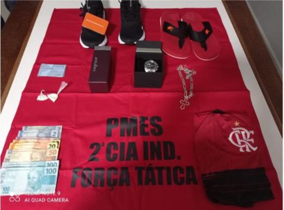 Os policiais abordaram os suspeitos, de 18, 21 e 22 anos e localizaram em posse deles os cartões bancários da vítima, parte do dinheiro furtado na residência e vários produtos que eles haviam adquiridos utilizando o cartão de recebimento da aposentadoria da idosa, com o qual eles compraram 01 par de tênis , 01 par de sandálias, 01 relógio, 01 cordão de prata, 01 camisa do Flamengo e 01 frasco de perfume.