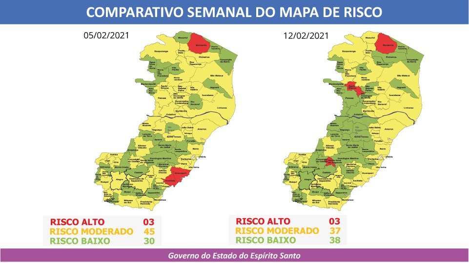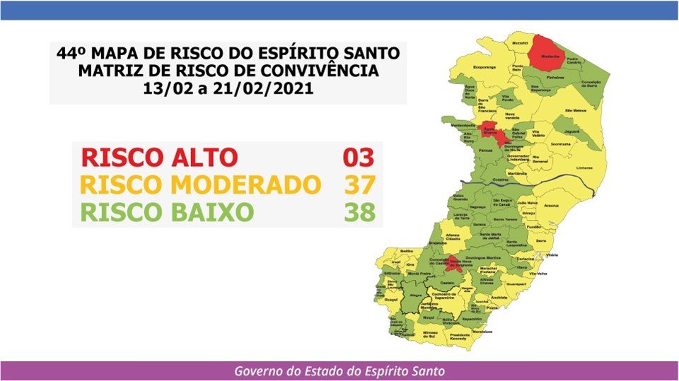 O Governo do Estado anunciou, nesta sexta-feira (12), o 44º Mapa de Risco Covid-19, que terá vigência, excepcionalmente, a partir deste sábado (13) até o próximo domingo (21). Dos 78 municípios capixabas, 38 estão classificados em Risco Baixo e 37 estão em Risco Moderado. Somente três municípios (Águia Branca, Montanha e Venda Nova do Imigrante) estão classificados como Risco Alto.