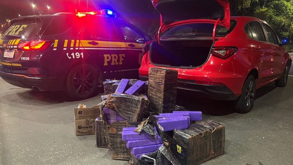 A Polícia Rodoviária Federal apreendeu mais de 300kg de maconha na noite desta quarta-feira (14) na BR-101, em Viana. A droga foi encontrada em um veículo Fiat Kronos de cor vermelha, conduzido por um homem de 40 anos, que foi preso.